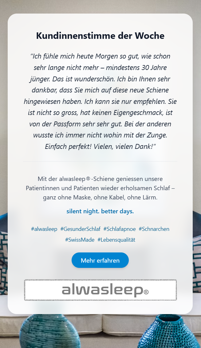 Das Dentallabor Alraun, die Vorgänger-Firma der ALWAFLEX AG, war seit vielen Jahren auf die Produktion hochwertiger Anti-Schnarchschienen spezialisiert. Die bewährte alwasleep®-Schiene, basiert auf dem effektiven Wirkmechanismus der Unterkiefer-Protrusion, der nachweislich das Schnarchen reduziert.